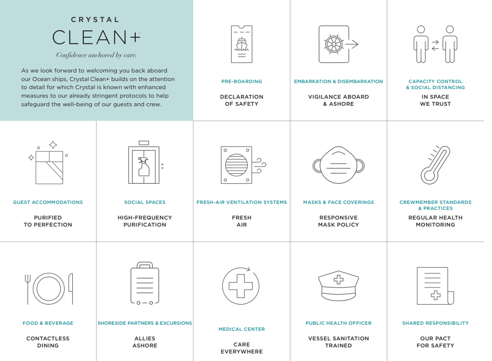 The Crystal Cruises team has been developing new procedures and policies that will support all public health and regulatory requirements and to ensure guests’ vacations continue to be not only relaxing and pleasurable but safe and healthy. Here is information on the recently launched Crystal Clean+® 2.0 – an enhanced level of measures to help safeguard the well-being of guests and crew.