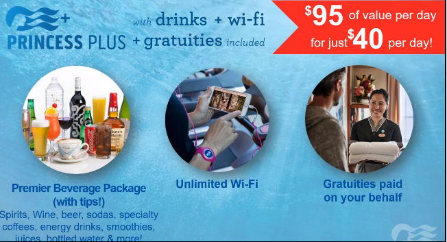One of the best promotions currently running is the Princess Plus program. For just $40.00 per person, per day, on all sailings, all destinations & all Staterooms, you get: