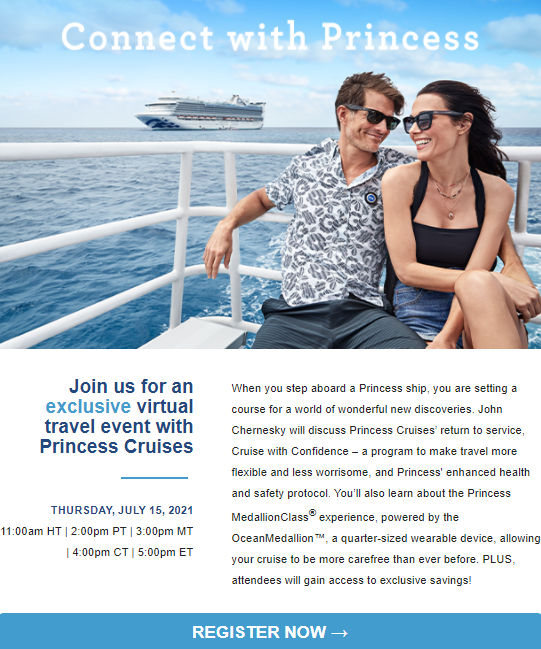 Join us for an Exclusive Virtual Event with Princess Cruises on Thursday, July 15th. Hosted by John, Chernesky, Senior VP at Princess cruises, and get access to exclusive offers.