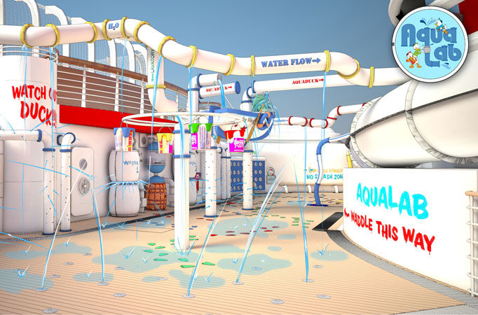 Guests can splash and play in the AquaLab – a brand-new water play area on deck 12, near the entrance to the AquaDuck water coaster. Families can frolic among pop jets, geysers and bubblers in this fun and fanciful 1,800-square-foot space. As the story goes, AquaLab was created by Donald Duck’s nephews, Huey, Dewey and Louie, and features a variety of water “experiments” designed to drench the whole family.- The Disney Fantasy features another new area for guests of all ages to cool off. On deck 12 forward, a wading pool with a fountain water feature, ample seating and lounge chairs under canopy offer a respite in the shade.