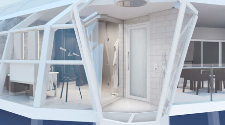 The new Celebrity Reflection sets sail this December with exciting new Suite options and onboard venues. This week Celebrity Reflection will float out of her enclosed building dock at the Meyer Werft shipyard, into the sunlight for the first time. Once docked at a nearby pier, her signal mast and funnels will be put in place by a crane. Celebrity Reflection is part of the Solstice class, but she stands alone. The new ship boasts an expanded deck, 72 additional staterooms overall, more seating in the main and specialty restaurants, more sun lounges on the pool deck, and more seats in the theatre. The new Celebrity Reflection suite has a shower that hangs over the side of the ship (pictured here,) for a view down to the ocean – not to worry you can see out but others can’t see in.