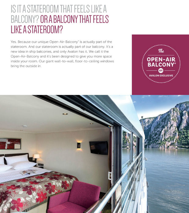 In designing their ships, Avalon has refused to see space as a barrier. That fact couldn’t be more true when you look at their ships’ inspired indoor/outdoor space. Other cruise lines, for instance, have chosen to sacrifice room space in order to provide travelers a small and often narrow balcony. In contrast, Avalon’s Open-Air BalconiesSM make full use of the intended balcony experience – in any weather condition, in any season – without compromising room space.
