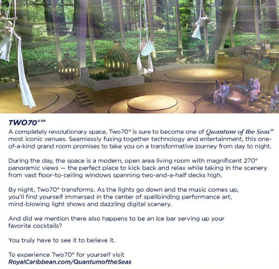 Quantum of the Seas boasts an incredible art collection, including interactive art created by the world’s best digital and video artists. Within the overall them of “What Makes Life Worth Living,” the SMART Art experieence is ship-wide and includes three types of digital media: video, interactive and kinetic. You will also be able to view all of your onboard photos on 22″ multi-touch screens. No more standing in line and zero paper waste with tons of photos being printed that were never purchased by cruisers. Here you print just want you want – making it the greenest photo operation at sea.
