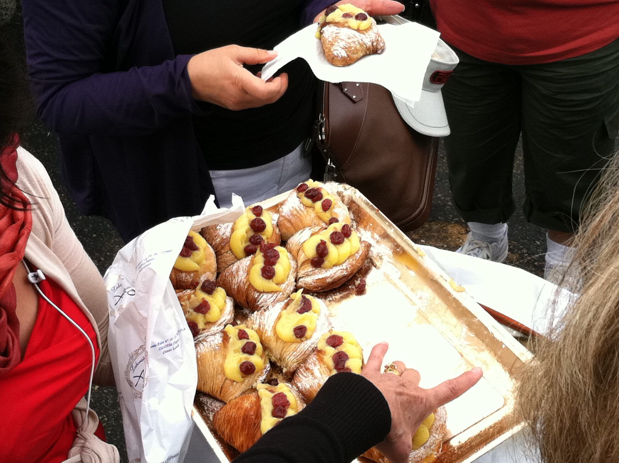 October 7th – 5:45 am wake up call – yikes! Breakfast at the Capri Palace and then back by taxi to the marina to take the hydrofoil to Naples. I could have stayed in Capri the remainder of the trip! During the 45 minute boat ride back, many fell asleep. It rained most of the day on our way to Florence from Naples, but this was our longest bus day, so at least it did not interfere with any sightseeing. The motor coach is quite comfortable with plenty of leg room. When we made our first stop for a bathroom break, the tour director surprised us with a tray of Neapolitan pastries. It was called Santa Rosa Fogliatella – something you only find in Naples. It looked a bit like a lobster tail and was filled with custard and cherries. How thoughtful! It brought a smile to everyone’s face.