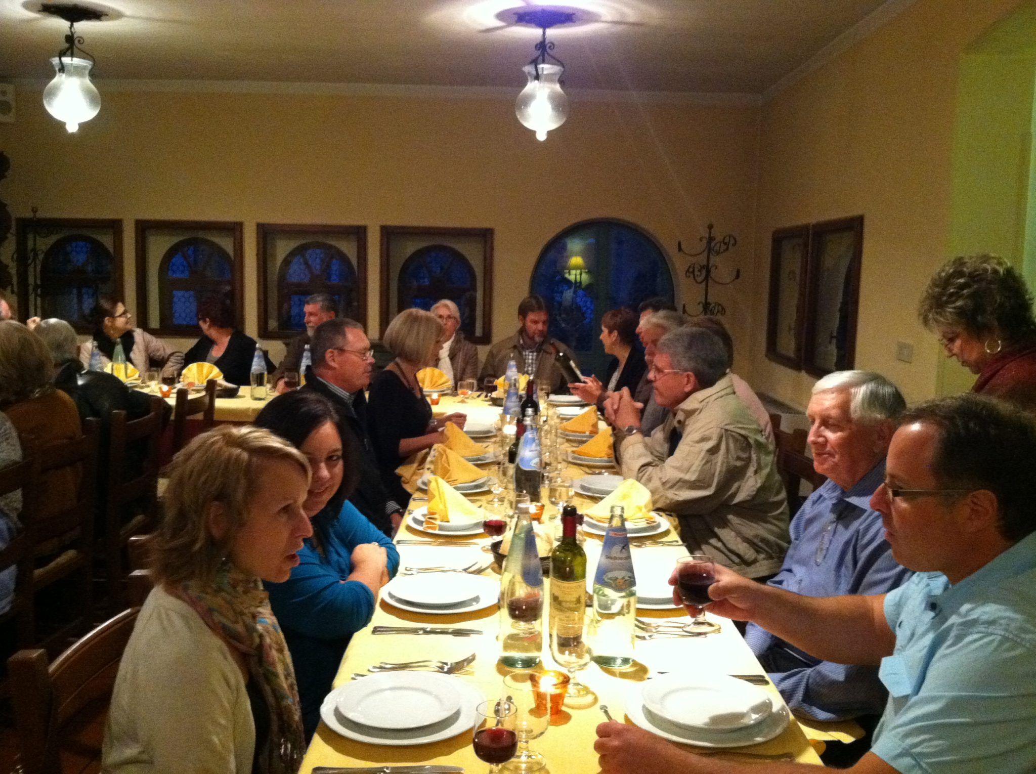 In the evening we had a choice of dinner on our own, or an optional dinner. About half of the group chose to take the optional. The couple that recommended San Gimignano were going on the Tuscan dinner so we decided to join them. This optional was 57 Euro pp. This may sound like a lot, but dinners in Italy are expensive no matter where you go. The restaurant was called Il Mulinaccio. We were served a traditional Tuscan meal with several courses as well as lots of Chianti wine. We really bonded as a group that night – perhaps the wine? The tour director played music on the way home and there was even some dancing in the isles.