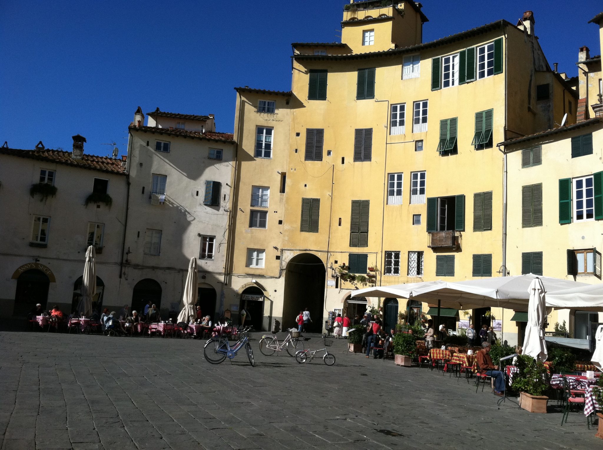 Today (October 11th,) we are on our way to Venice, with stops in Pisa and Lucca. Breakfast had the largest selection of any of the hotels. It was about a 30 minute drive to Pisa. Our driver parked in a big lot and the tour director had a train waiting to pick us up to take us to the entrance. We had 1 hour there for pictures and to walk around. Train back, onto the motorcoach and off to Lucca where a local guide met us. By the way having the train was not only a time saver, but it made the rest of the day easier on everyone. Lucca is the birthplace of Pucchini. It is said he began to play the piano at age 4. It is the only town in Italy completely surrounded by walls. They were built in the 16th century to protect the town from invaders, and are 4 kilometers long. You will find some of the finest Renaissance and Medieval architecture in Lucca. There was amphitheater (pictured here,) with seating for about 10,000 where they would hold gladiator battles. The area is known for silk, wool and pepper.