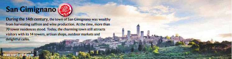 There are roughly only 700 full-time residents, but the city abounds with small restaurants and gift shops. One of these is a gelato shop that won ‘best in taste’ two years running and whose owner is now a judge in this important competition. Walk through the preserved town square, the Piazza della Cisterna and visit the Palazzo del Popolo, a 13th century town hall.