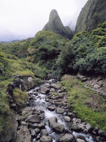 In the inland center of Maui is Iao Valley State Park, home to the landmark 1,200-foot Iao Needle. This towering rock formation juts upward from the valley floor, a ragged peak of brown lava rock that contrasts with the blue skies and lush, deep green vegetation. Hiking trails abound near the Needle that lead to lookout points with stunning views of both the Needle itself and the surrounding scenery.