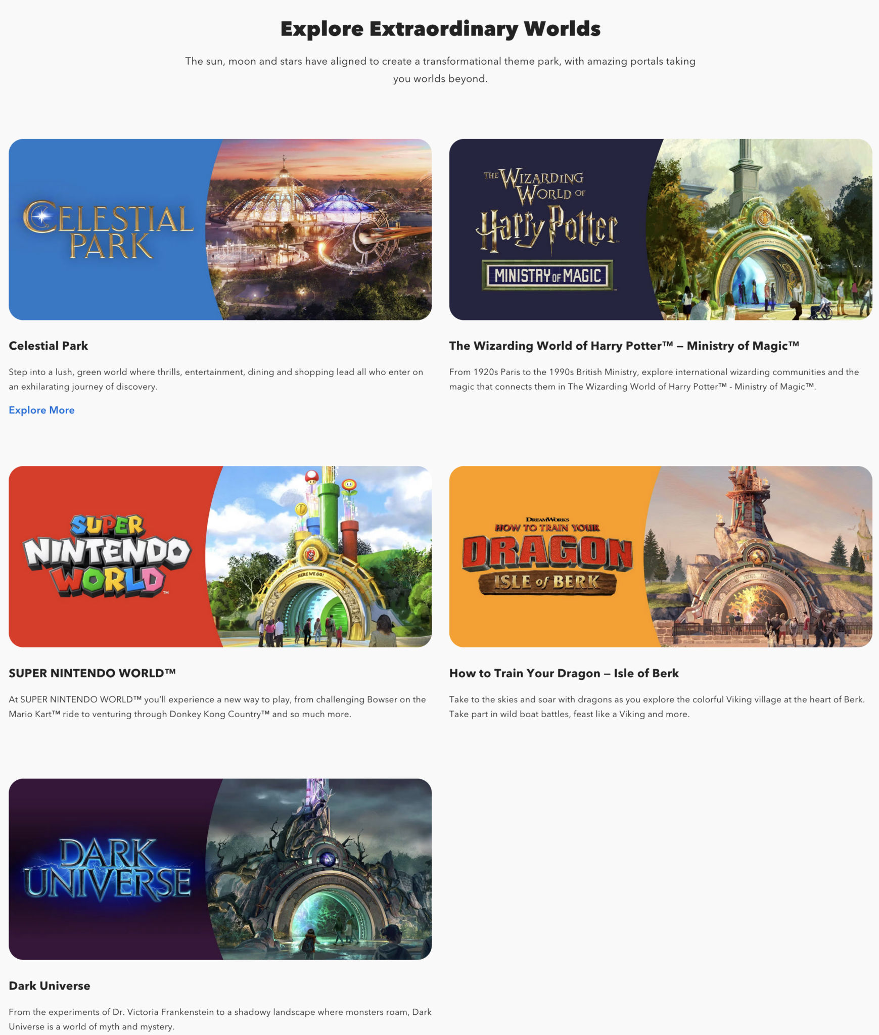 - How to Train Your Dragon – Isle of Berk, where guests can soar with dragons in a colorful world filled with Viking adventures based on the wildly popular How to Train Your Dragon film franchise; and Dark Universe, where guests encounter everything from the experiments of Dr. Victoria Frankenstein to the shadowy landscape where monsters roam in a world of myth and mystery.
