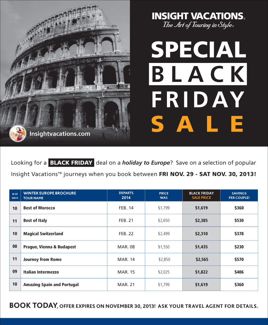 Insight tour vacations is offer BLACK FRIDAY deals on travel to Europe.