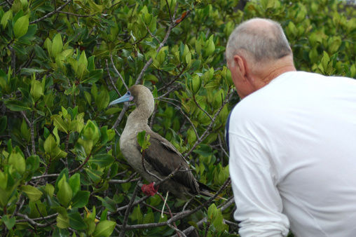 (GENOVESA) ISLAND is a low volcano barely breaking the surface of the ocean. It attracts vast numbers of pelagic seabirds who come here to nest. Great frigate birds, red-footed boobies, swallow-tailed gulls and storm petrels all breed here by the thousands. A trail leads from a coral beach past tidal lagoons where lava gulls and yellow-crowned night herons are seen, then along the low shrubs populated by frigates and boobies, and eventually to a cliff edge where seabirds soar. A second trail leads to an open area for masked boobies, more frigates, and red-foots. At the end of the trail thousands of band-rumped storm petrels flutter at the cliff’s edge, where they nest in crevices. Short-eared owls can sometimes be seen here, hunting the storm petrels during daylight hours.