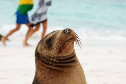 SEYMOUR ISLAND is an uplifted (as opposed to volcanic) island and so is generally flat and strewn with boulders. There are good nesting sites here for a large population of magnificent frigate birds. Blue-footed boobies perform their courtship dance in the more open area, and swallow-tailed gulls perch on the cliff edges. Despite the tremendous surf that can pound the outer shore, sea lions haul out onto the beach and can be found together with marine iguanas.
